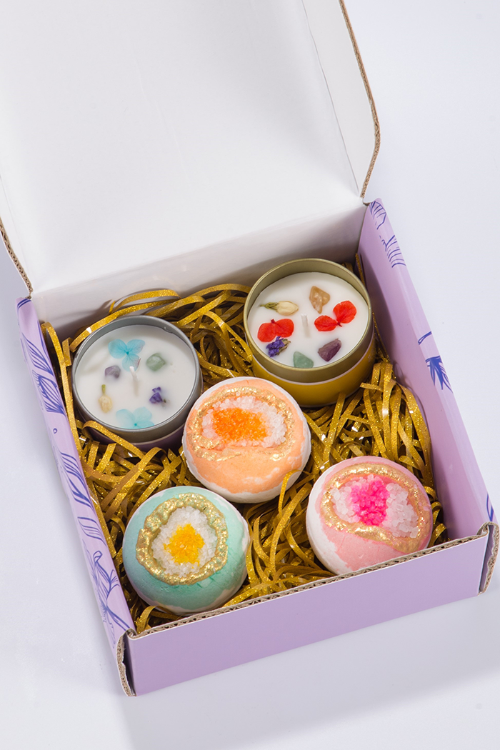 - Encuentra tu tarjeta personal, 3 bombas de baño ecológicas y naturales (limón, rosa y té verde) y 2 velas de aromaterapia de cera de soja (orquídea blanca y lavanda de Provenza);