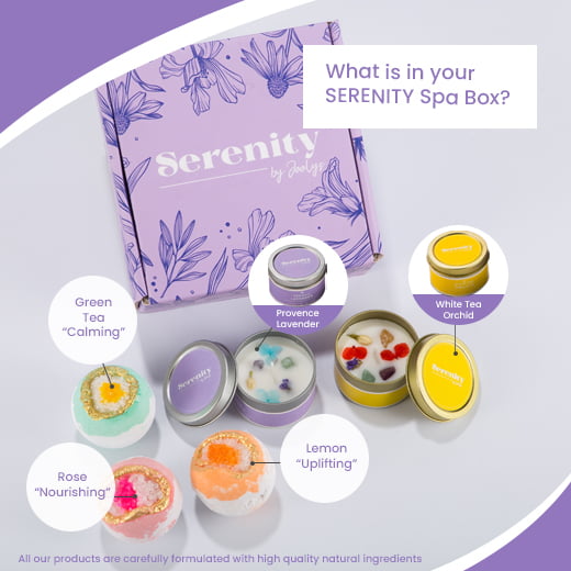 Aquí te ofrecemos un set de aromaterapia Serenity Spa de Joolys de Porto para que te relajes en el baño. Se trata de una caja formada por los siguientes elementos: