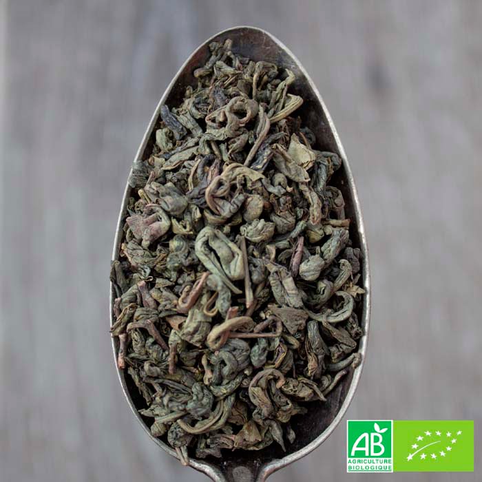 Um chá verde da China Gunpowder de alta qualidade com folhas enroladas e um sabor ligeiramente amargo. Cultivo biológico.